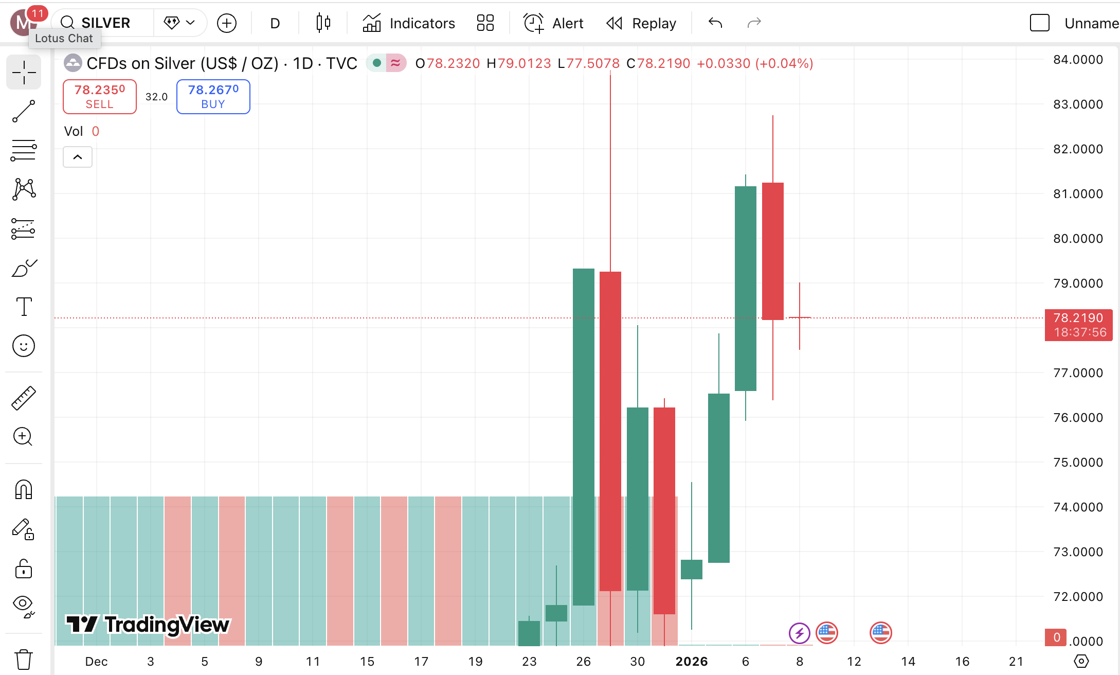 Trên thị trường quốc tế, giá bạc giao ngay đang dao động trong khoảng 77–79 USD/oz, giảm mạnh so với phiên ngày 7/1 (theo giờ Việt Nam), khi giá còn đứng ở vùng 81–82 USD/oz.