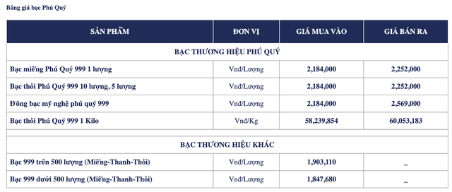 Theo đó, Phú Quý niêm yết giá bạc hôm nay với vùng giá giao dịch mới là 58,8 triệu đồng/kg, tương đương 2,245 triệu đồng/lượng.