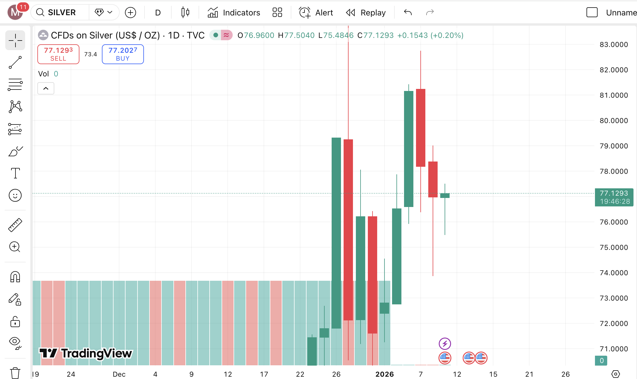 Trên thị trường quốc tế, giá bạc giao ngay theo giờ Việt Nam đang được ghi nhận quanh mức 77,1 USD/oz. Mặc dù thấp hơn so với ngày 8/1, song mức giá này đã phục hồi đáng kể nếu so với vùng đáy 75,5 USD/oz trong đêm qua, cho thấy tín hiệu tích cực trở lại của thị trường bạc thế giới.