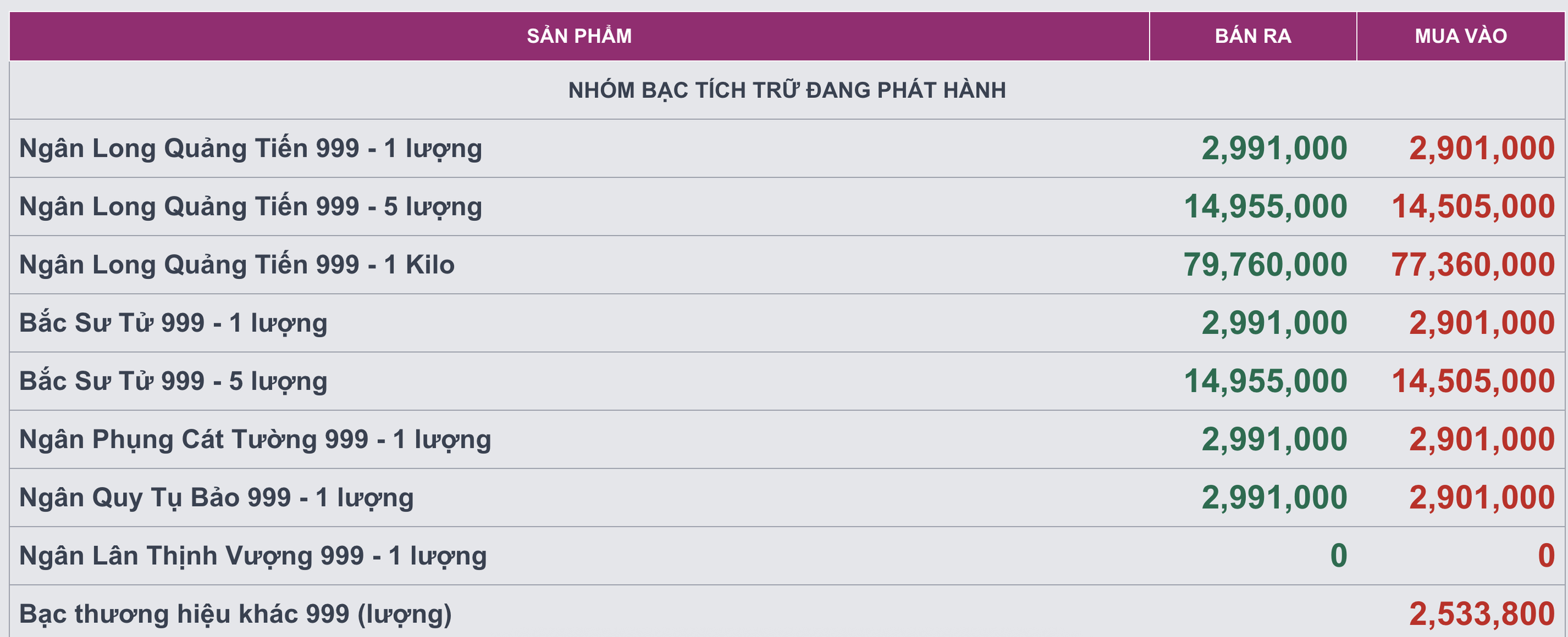 Cùng xu hướng, Sacombank-SBJ niêm yết giá bạc Kim Phúc Lộc ở mức 80,4 triệu đồng/kg, tương đương 3,015 triệu đồng/lượng.