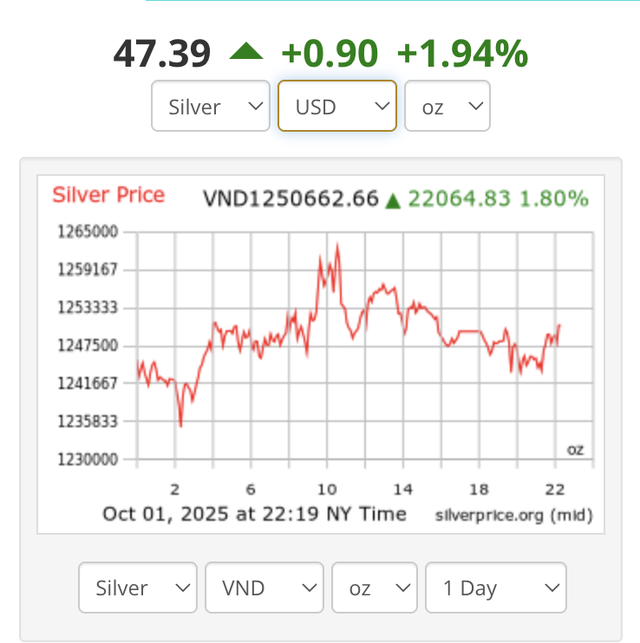 Sáng nay, giá bạc thế giới nhảy từ 47,22 USD/oz lên 47,39USD/oz. Ảnh: silverprice.org