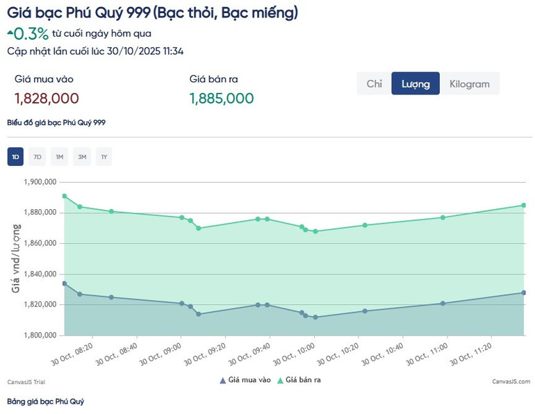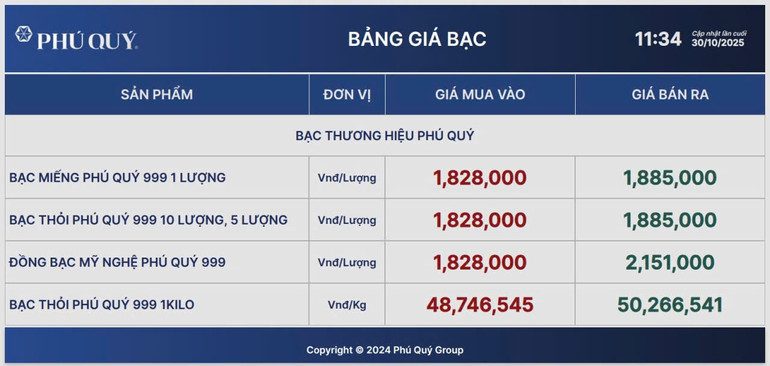 Tập đoàn Vàng bạc Đá quý Phú Quý niêm yết giá bạc miếng và bạc thỏi 999 mua vào-bán ra tại thời điểm 11 giờ 34 phút ngày 30/10 ở mức 1.828.000 đồng/lượng (mua vào) và 1.885.000 đồng/lượng (bán ra), tăng lần lượt 9.000 đồng/lượng (mua vào) và 10.000 đồng/lượng ở chiều bán ra so cuối giờ sáng hôm qua.
