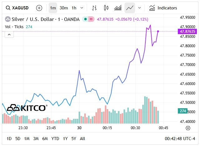 Tại thị trường thế giới, theo kitco.com, tính đến 11 giờ 40 phút ngày 30/10 (giờ Việt Nam), giá bạc tăng nhẹ 0,3 USD/ounce so với phiên trước, giao dịch quanh mức 47,8 USD/ounce. Đêm qua, có những thời điểm giá bạc lên 48,3 USD/ounce.