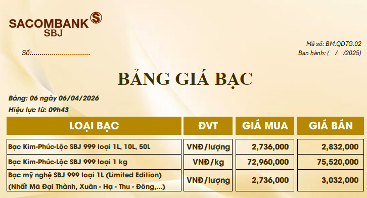 Tại Sacombank - SBJ, giá bạc miếng 999 loại 1 lượng được niêm yết ở mức 2,73 - 2,83 triệu đồng/lượng (mua - bán). Đối với bạc thỏi 999 loại 1kg, thương hiệu này cũng ghi nhận mức giảm, hiện giao dịch tại 72,9 - 75,5 triệu đồng/kg.