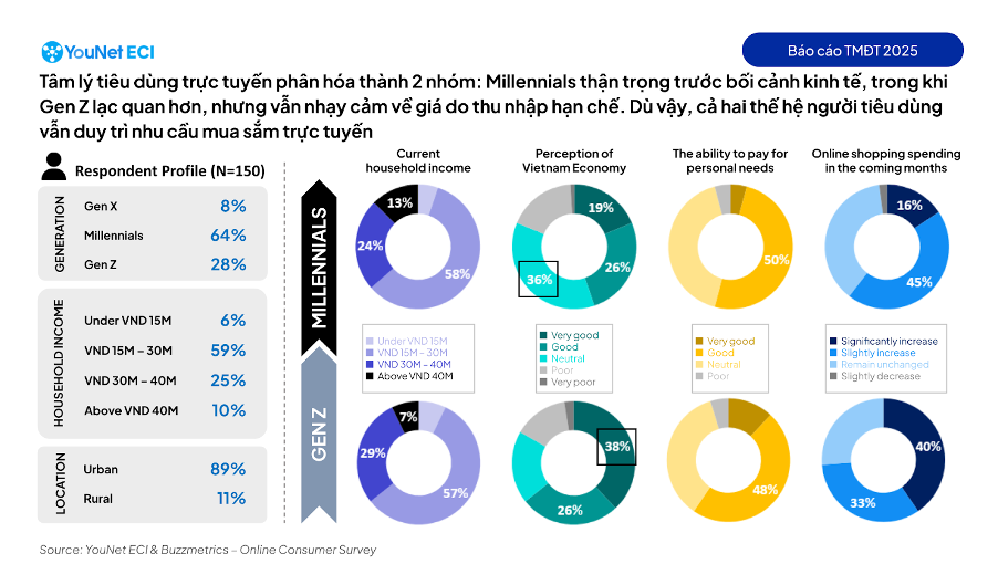 Khảo sát người tiêu dùng trực tuyến do YouNet ECI phối hợp với Buzzmetrics thực hiện trong quí 4-2025 cho thấy người mua ngày càng nhạy cảm hơn với biến động giá. Ở nhóm Gen Y (1981-1996), 36% người được hỏi giữ quan điểm trung lập và 45% đánh giá tích cực về tình hình kinh tế. Trong khi đó, 64% Gen Z (1997-2012) nhìn nhận kinh tế hiện tại theo hướng tích cực, dù cùng tỷ lệ này cho biết thu nhập hộ gia đình dưới 30 triệu đồng mỗi tháng.