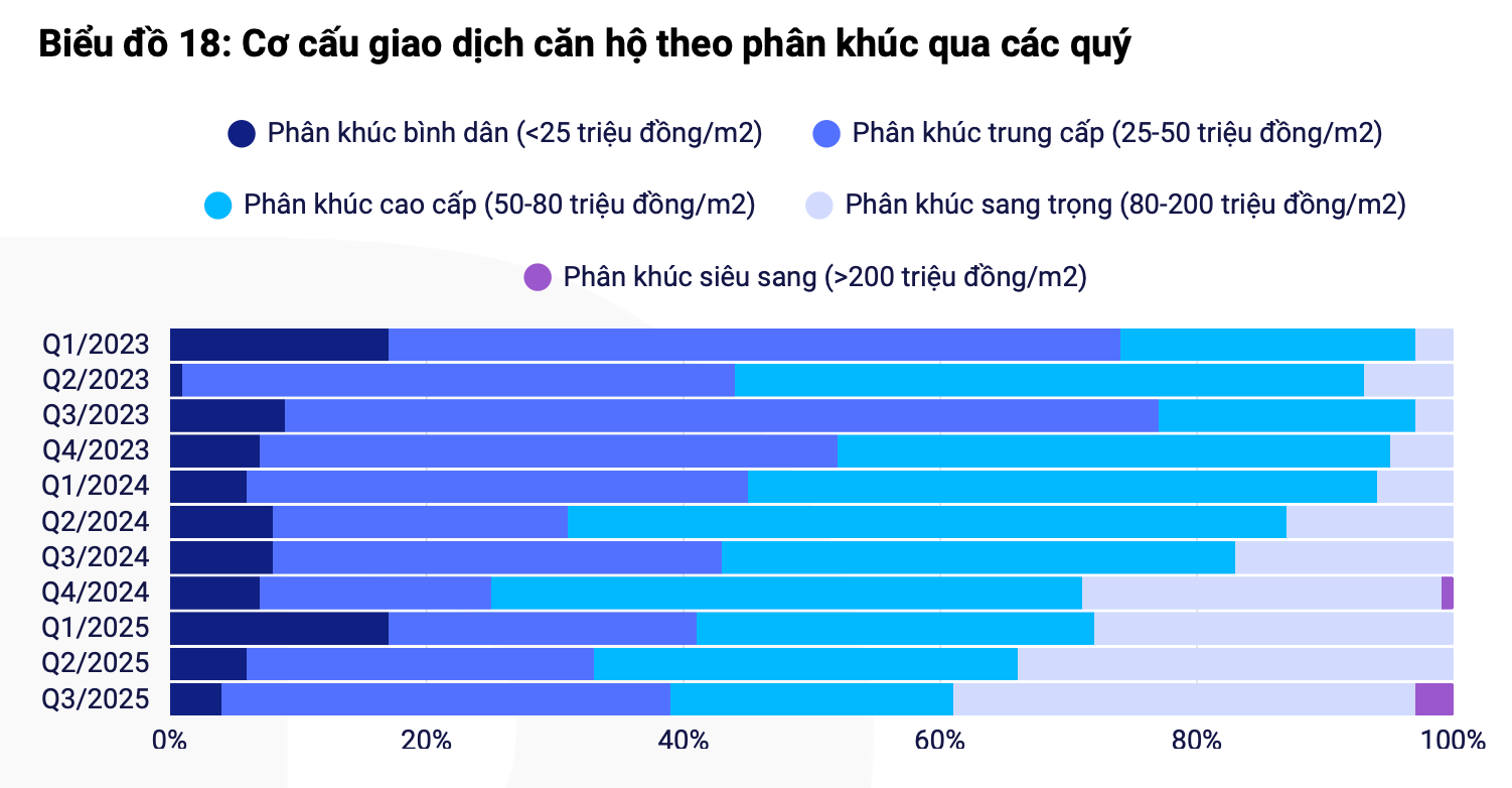 Riêng tại Hà Nội, giá căn hộ sơ cấp trung bình đạt 95 triệu đồng/m2, với hơn 43% nguồn cung mới có giá trên 120 triệu đồng/m2. Tại TP. HCM (cũ), giá sơ cấp trung bình đạt 91 triệu/m2, thấp hơn Hà Nội nhờ nguồn cung từ khu vực ngoại thành có mặt bằng giá thấp hơn đáng kể.
