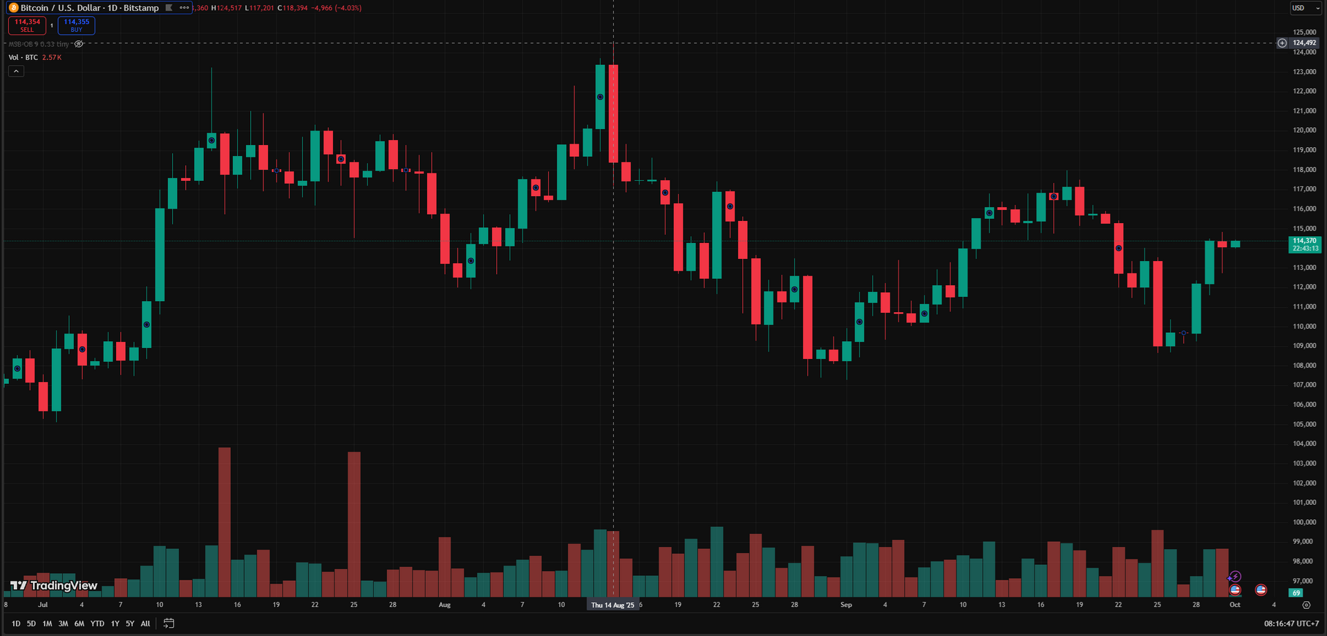 Bitcoin vừa có một tháng 9 hiếm hoi tăng trưởng, trái ngược hoàn toàn với lịch sử vốn thường ảm đạm trong giai đoạn này. Tính đến ngày cuối cùng của tháng, BTC giao dịch quanh mức 114.200 USD, tăng khoảng hơn 4,5% so với đầu tháng. Đây là một tín hiệu quan trọng, bởi trong quá khứ, mỗi lần Bitcoin kết thúc tháng 9 trong sắc xanh thì quý 4 thường bùng nổ mạnh mẽ, với mức tăng trung bình hơn 53%.