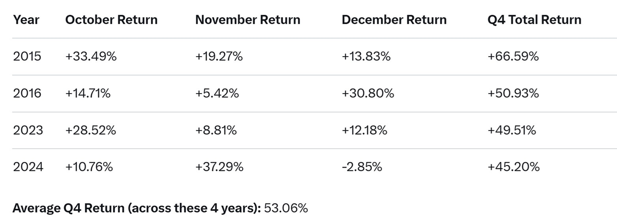 Lợi nhuận theo quý của Bitcoin sau tháng 9 “xanh” - Ảnh: CoinGlass