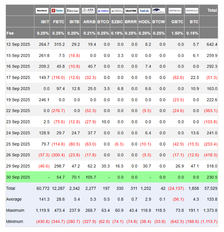 Trong 24 giờ qua, dòng tiền vào các quỹ ETF Bitcoin ghi nhận sự khởi sắc đáng chú ý sau chuỗi ngày biến động mạnh. Tổng dòng tiền tính đến 30.9 đạt 230,5 triệu USD, cho thấy lực mua quay trở lại, tạo tâm lý tích cực cho thị trường.