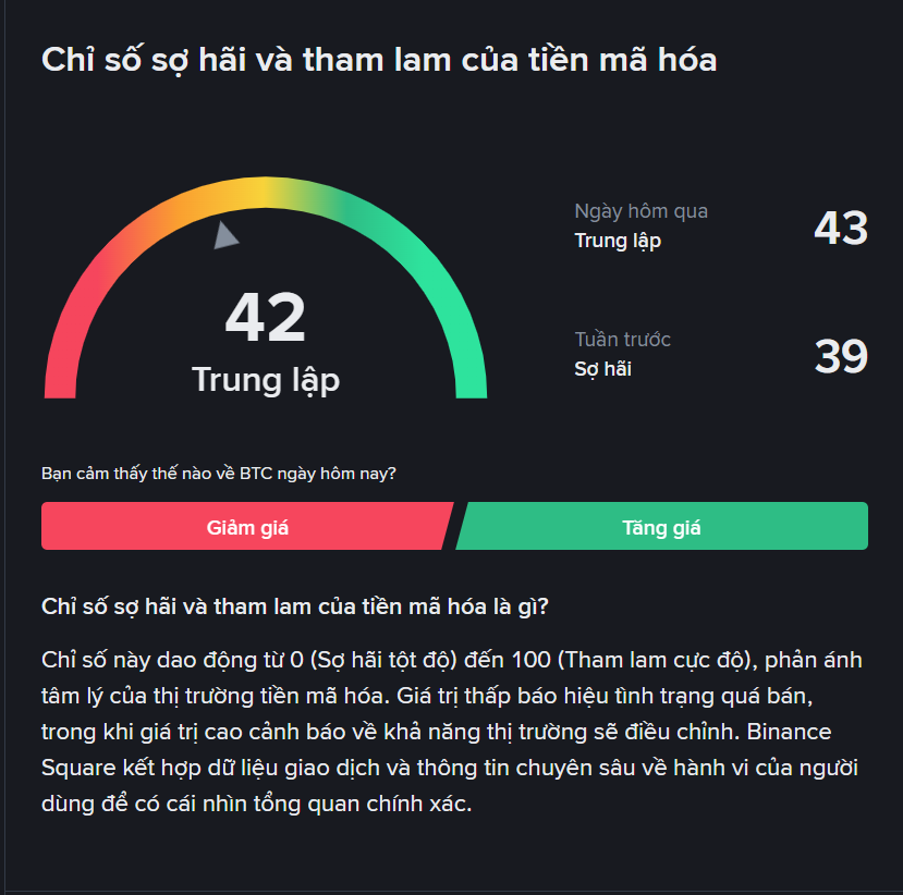 Dựa trên dữ liệu từ Binance, chỉ số “sợ hãi” và “tham lam” (Fear & Greed Index) cho thị trường tiền mã hóa (chủ yếu dựa trên Bitcoin và các đồng coin lớn) hiện ở mức 42 được phân loại là trung lập (Neutral).
