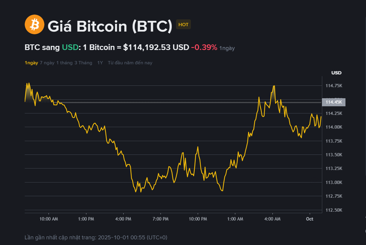 Tính đến sáng 1.10, Bitcoin được giao dịch quanh 114.192 USD, giảm 0,39% trong 24 giờ qua - Ảnh: Binance