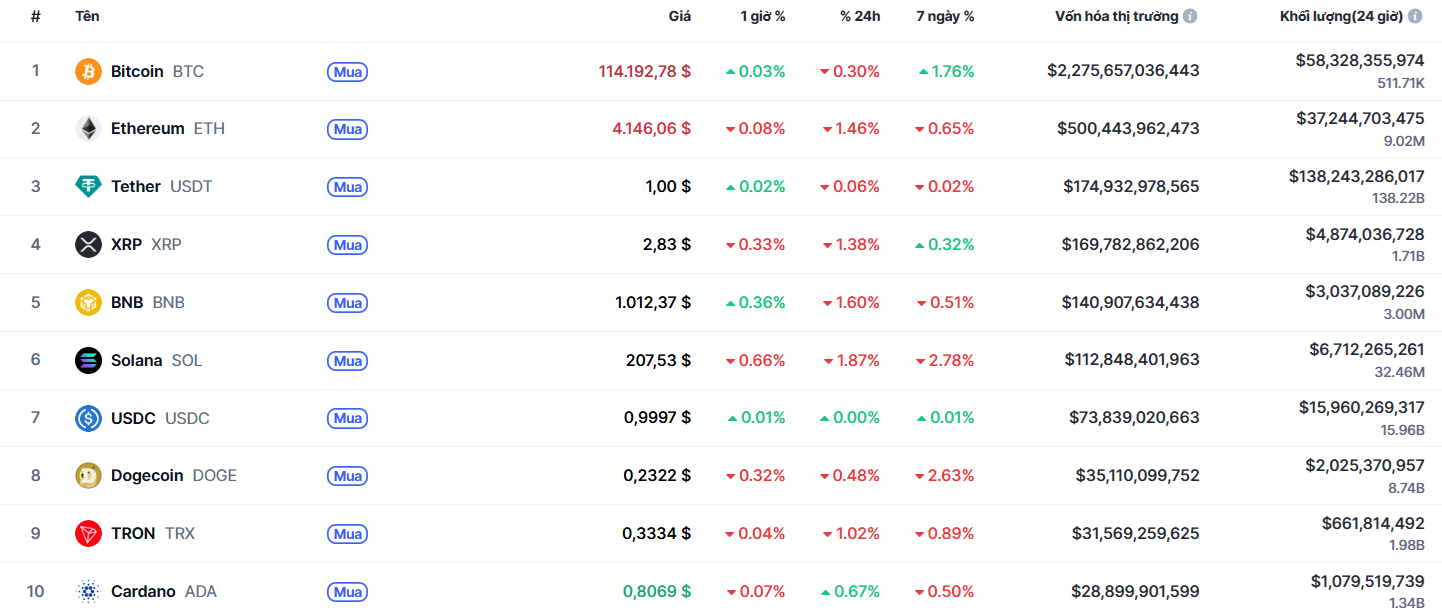 Bitcoin (BTC) vẫn giữ sức mạnh nhất định khi được giao dịch trên 114.00 USD. Vốn hóa thị trường hiện đạt 2.276 tỉ USD. Khối lượng giao dịch trong 24 giờ khoảng 60 tỉ USD, với biên độ dao động từ 112.600 - 114.700 USD.