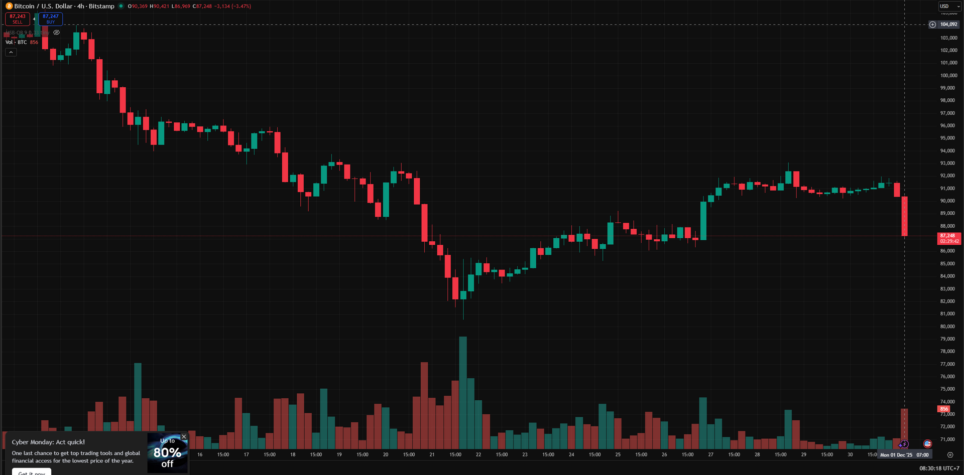 Trên khung 4 giờ, Bitcoin từng có giai đoạn tích lũy đi ngang khá ổn định quanh vùng 90.000 - 92.000 USD. Đây là vùng được xem như nỗ lực giữ giá của phe mua sau nhịp phục hồi. Tuy nhiên, cú sụt giảm mạnh trong phiên mới nhất đã phá vỡ cấu trúc đi ngang này, kéo giá rơi thẳng về dưới mốc 88.000 USD.