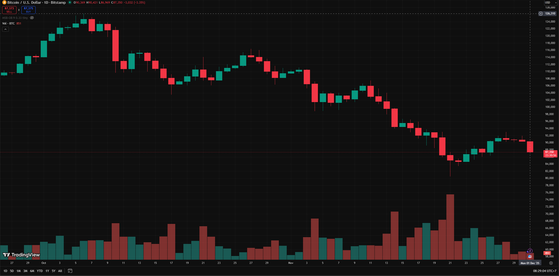 Biểu đồ giá theo ngày của BTC tính đến 1.12 - Ảnh: TradingView/Bitstamp