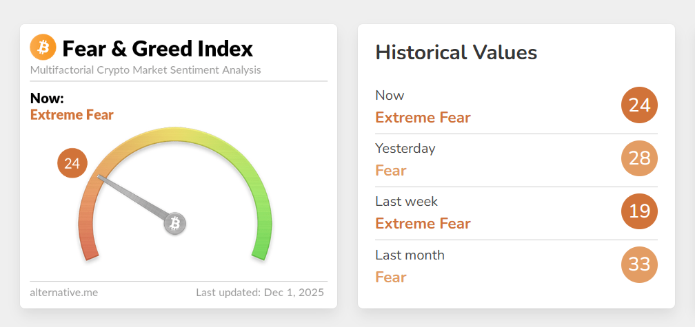 Chỉ số Sợ hãi & Tham lam (Fear & Greed Index) ngày 1.12 giảm xuống còn 24 điểm, đưa thị trường trở lại vùng “sợ hãi tột độ”. Đây là mức phản ánh tâm lý bi quan rõ rệt của nhà đầu tư sau chuỗi giảm mạnh của Bitcoin, đặc biệt khi giá trượt xuống dưới 90.000 USD. Trong bối cảnh này, phần lớn thị trường đang ưu tiên phòng thủ hơn là mạo hiểm, khiến dòng tiền giao dịch trở nên dè chừng.