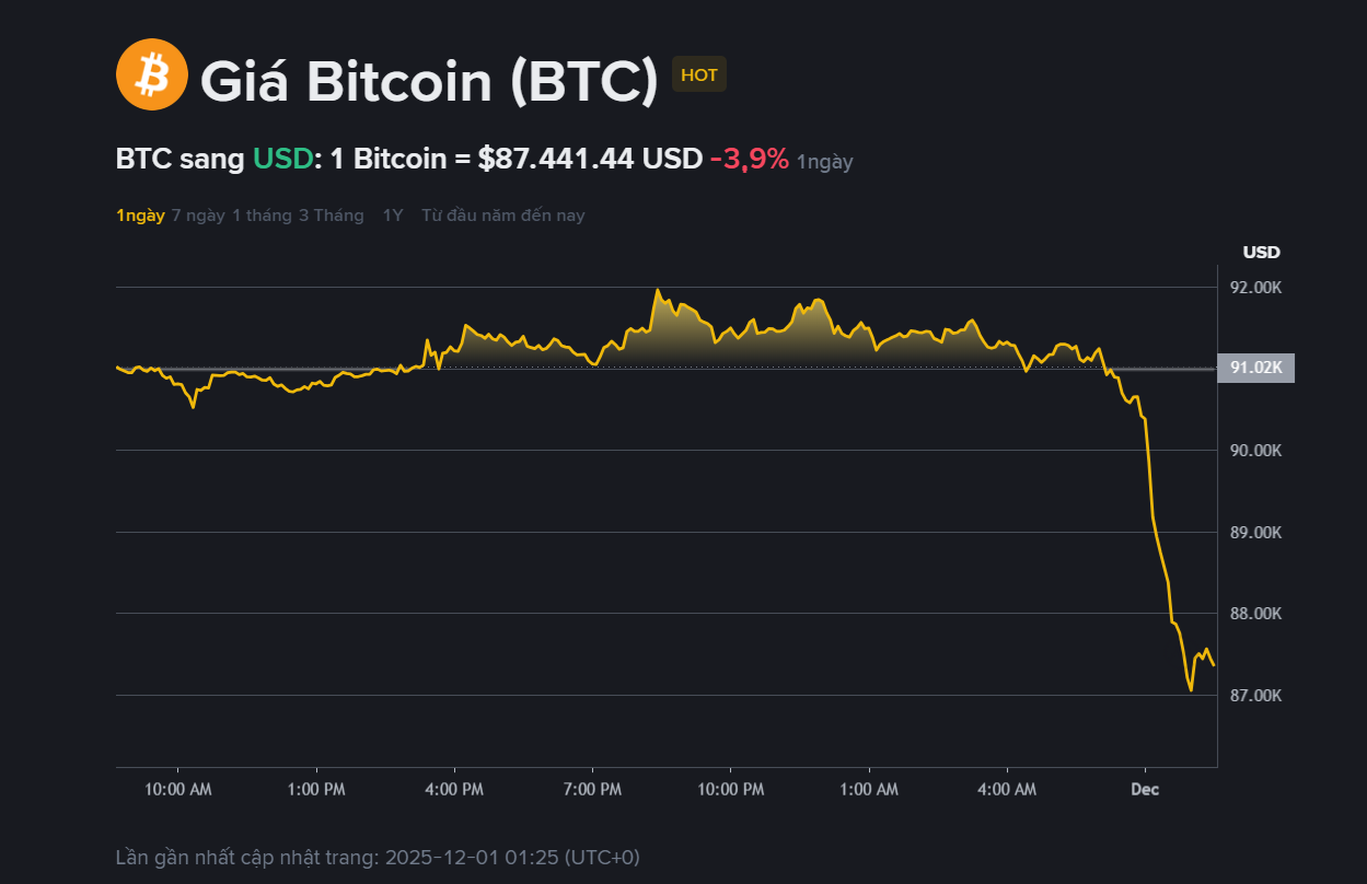 Giá Bitcoin hiện đang xoay quanh mốc 87.441 USD, đưa vốn hóa thị trường xuống khoảng 1.744 tỉ USD. Khối lượng giao dịch 24 giờ đạt gần 50 tỉ USD. Trong phiên giao dịch ngày 30.11, Bitcoin chủ yếu di chuyển trong biên độ hẹp và dao động quanh vùng 90.000 - 92.000 USD trước khi về mức hiện tại.