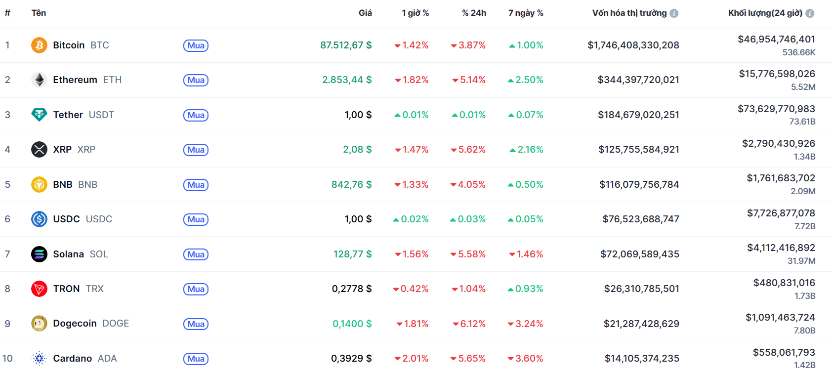 Biến động của Top 10 đồng coin lớn nhất thế giới