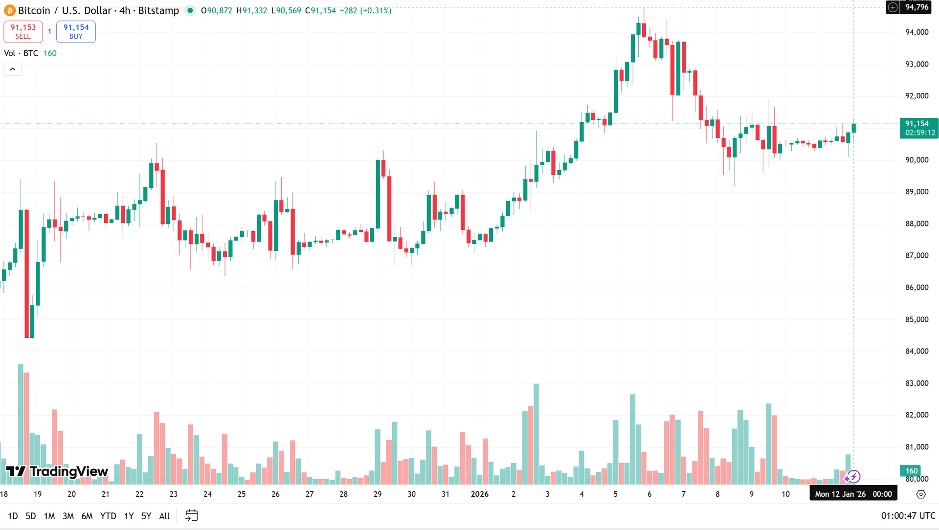 Ở khung thời gian 4 giờ (H4), Bitcoin duy trì đà hồi phục ngắn hạn nhưng vẫn rơi vào trạng thái giằng co. Sau khi tăng mạnh và tiệm cận vùng 94.500 USD, giá đã quay đầu điều chỉnh và hiện giao dịch quanh khu vực 91.000 - 91.500 USD, phản ánh lực cầu vẫn hiện diện nhưng chưa đủ mạnh để tạo cú bứt phá mới.