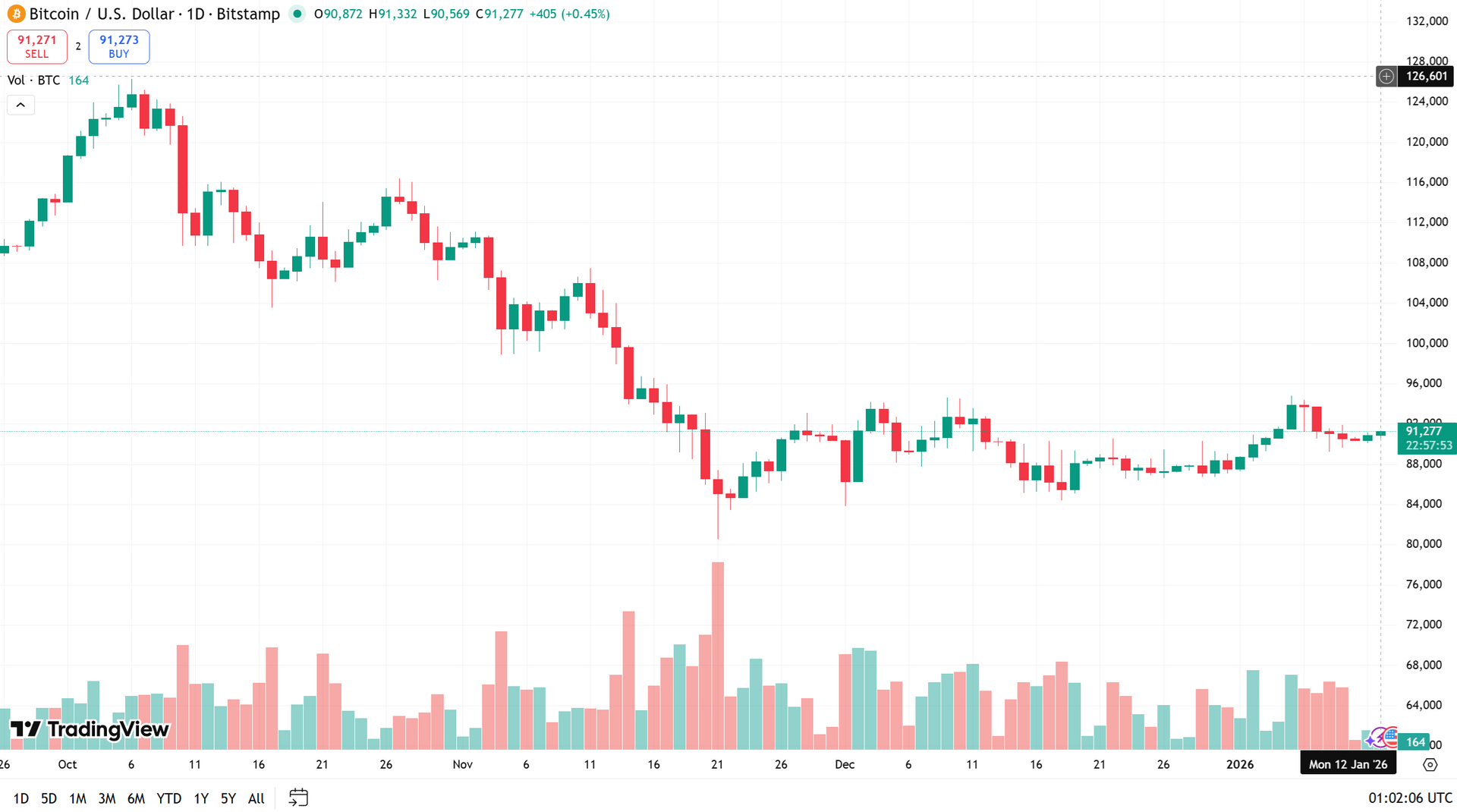 Trên khung ngày (D1), Bitcoin đang trong giai đoạn điều chỉnh kết hợp tích lũy sau nhịp giảm sâu từ cuối năm ngoái. Sau khi hình thành vùng đáy quanh 85.000 USD, giá đã ổn định hơn và dao động chủ yếu trong biên độ 90.000 - 92.000 USD, cho thấy áp lực bán đã giảm đáng kể so với giai đoạn trước.