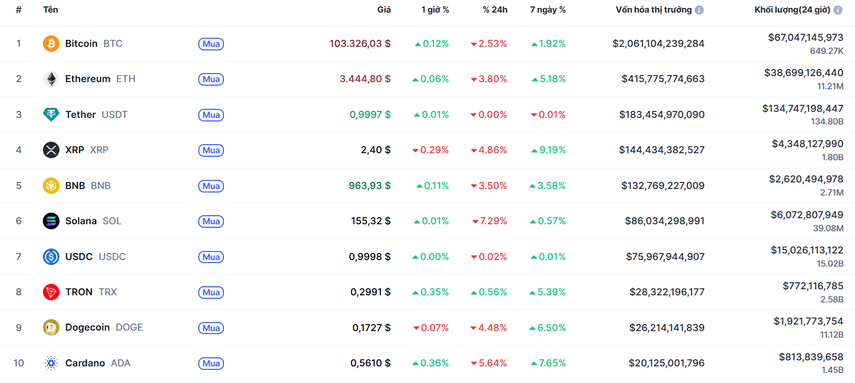 Biến động của Top 10 đồng coin lớn nhất thế giới