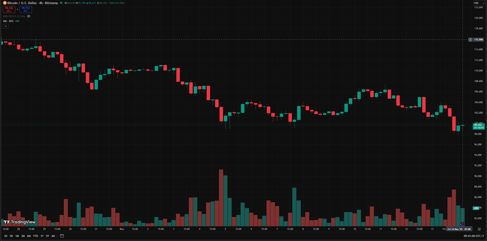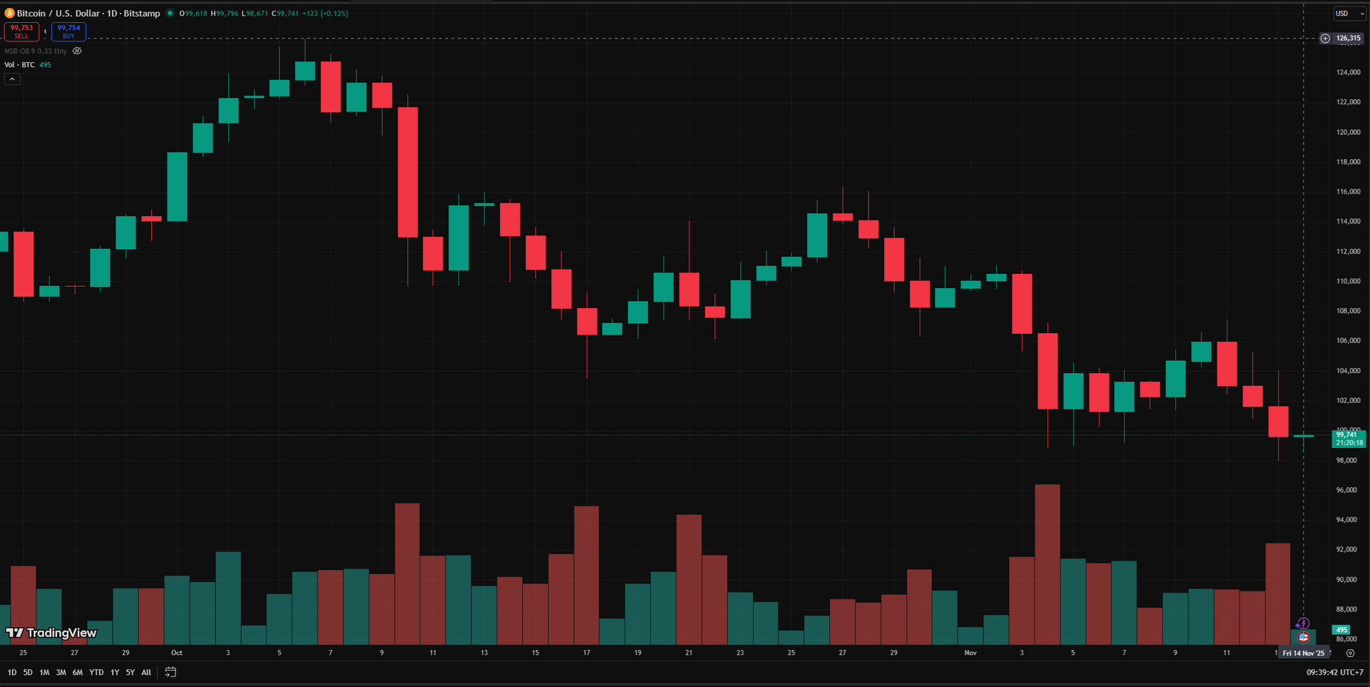 Tính đến sáng 14.11, Bitcoin được giao dịch quanh 99.650 USD, giảm 2,3% trong 24 giờ qua - Ảnh: Binance