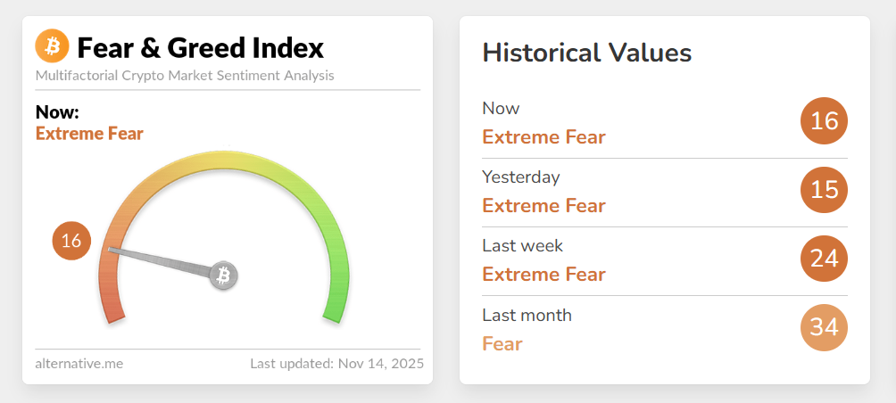 Chỉ số Sợ hãi & Tham lam (Fear & Greed Index) của thị trường tiền mã hóa trong ngày 14.11 tiếp tục duy trì ở vùng “sợ hãi tột độ” (Extreme Fear), đạt mức 16 điểm, tăng nhẹ so với 15 điểm của ngày hôm qua. Mặc dù có sự cải thiện nhỏ, tâm lý chung của nhà đầu tư vẫn đang ở trạng thái bi quan và thận trọng. Niềm tin vào thị trường chưa được khôi phục sau chuỗi ngày giảm mạnh của Bitcoin và các đồng tiền số lớn.