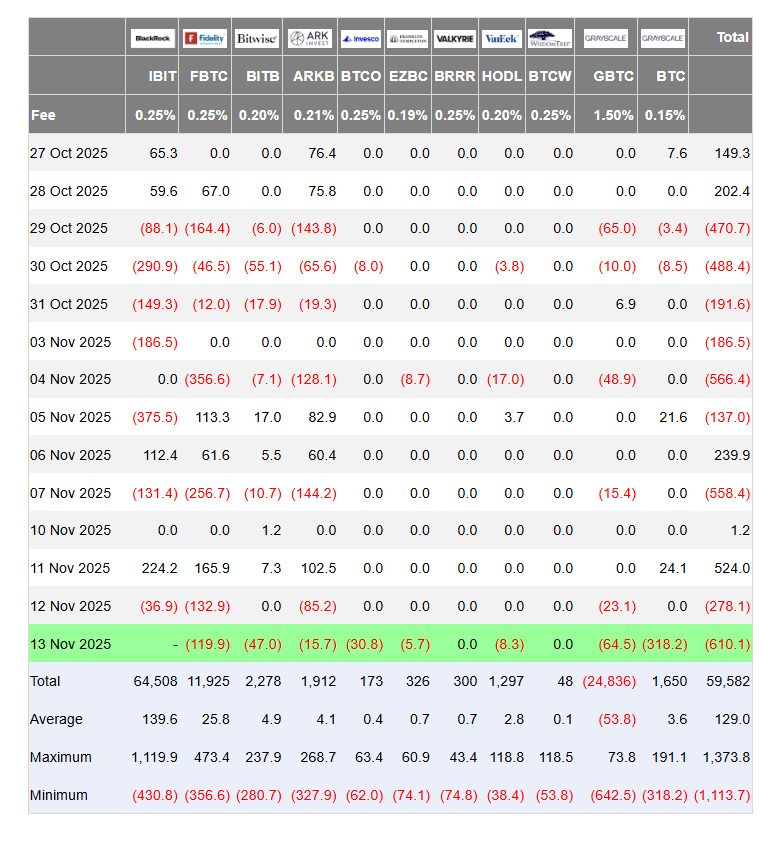 Dòng tiền ETF Bitcoin (chưa tính BlackRock) trong ngày 13.11 tiếp tục sụt giảm mạnh, với tổng giá trị rút vốn lên tới 610,1 triệu USD - mức thấp nhất trong gần hai tuần. So với ngày 12.11, khi các quỹ ghi nhận dòng tiền âm 278,1 triệu USD, mức rút vốn lần này tăng gấp đôi, cho thấy áp lực thoái vốn từ các nhà đầu tư tổ chức đang gia tăng đáng kể sau giai đoạn phục hồi ngắn ngủi trước đó.