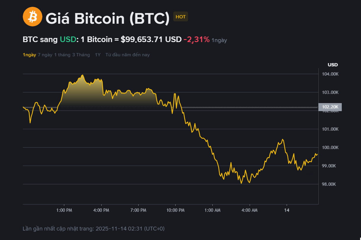 Giá Bitcoin hiện đang giao dịch quanh 99.650 USD, với vốn hóa thị trường xấp xỉ 2.000 tỉ USD và khối lượng giao dịch 24 giờ vượt mốc 100 tỉ USD. Trong phiên ngày 13.11, thị trường ghi nhận mức dao động lớn, khi Bitcoin liên tục trượt lên xuống trong biên độ 98.000 - 104.000 USD.