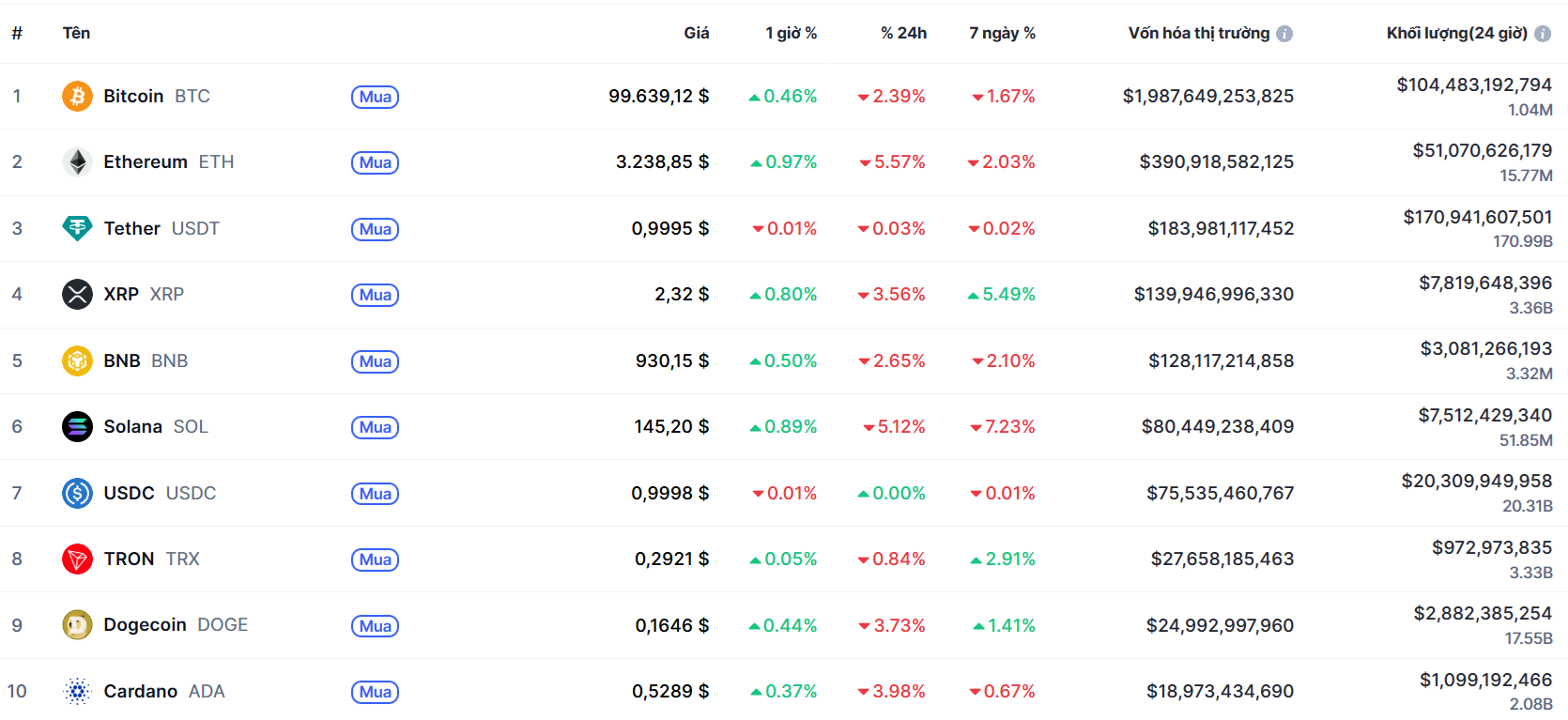 Biến động của Top 10 đồng coin lớn nhất thế giới