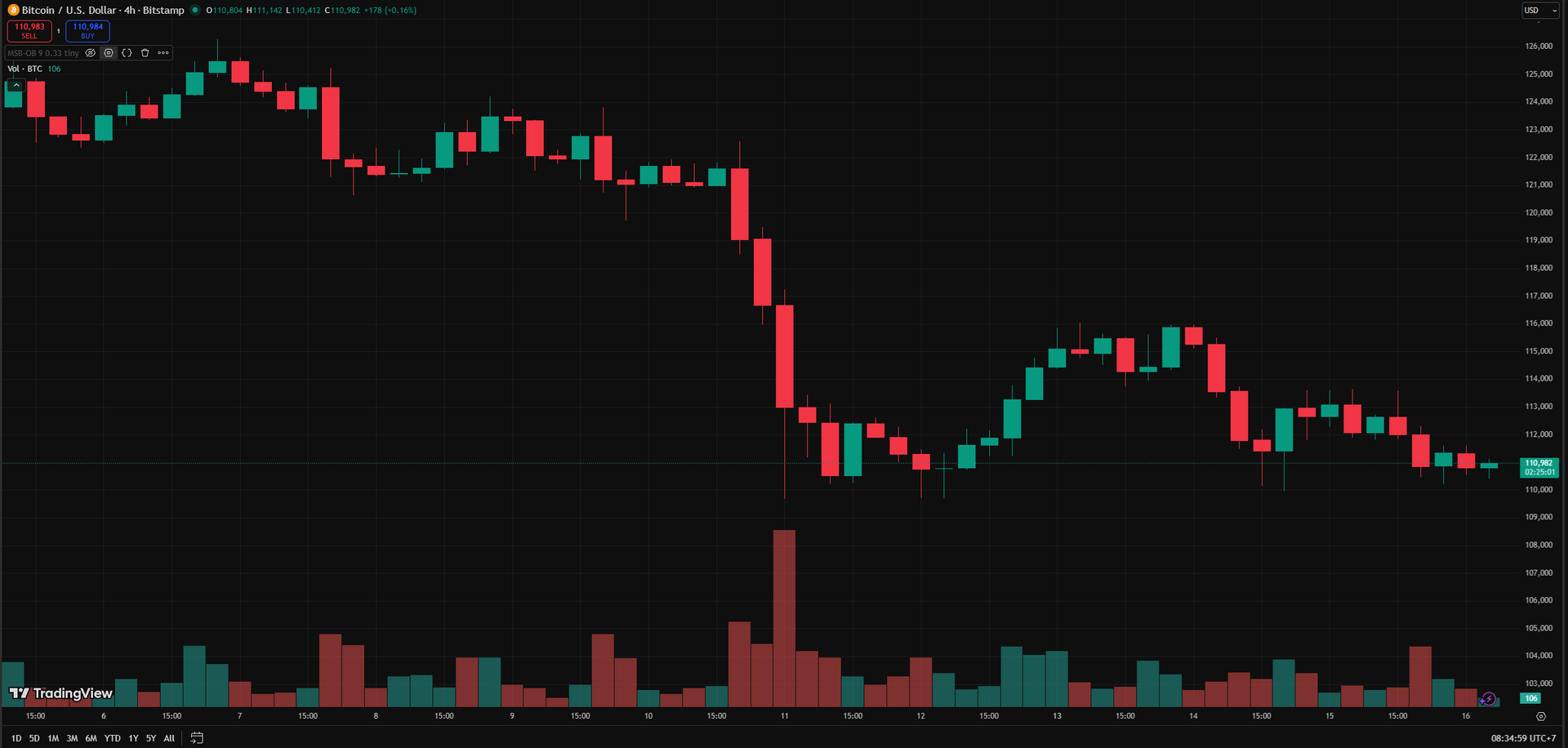Quan sát trên khung 4 giờ, cấu trúc giá vẫn nghiêng về xu hướng giảm sau đợt rơi sâu từ 122.600 USD xuống 109.000 USD. Bitcoin chủ yếu dao động trong vùng 110.500 - 113.500 USD, và mỗi lần tiến gần mốc 114.000 USD đều nhanh chóng bị đẩy lùi, phản ánh việc phe bán vẫn kiểm soát cuộc chơi.