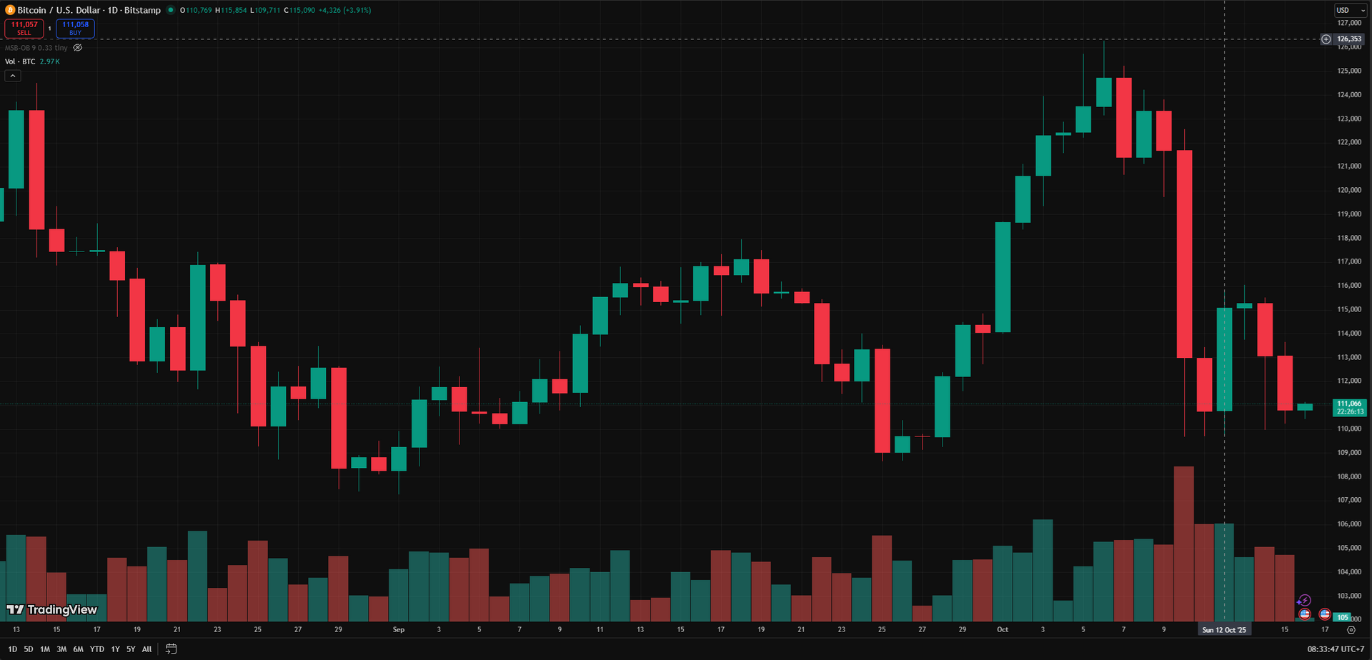 Biểu đồ giá theo ngày của BTC tính đến 16.10 - Ảnh: TradingView/Bitstamp