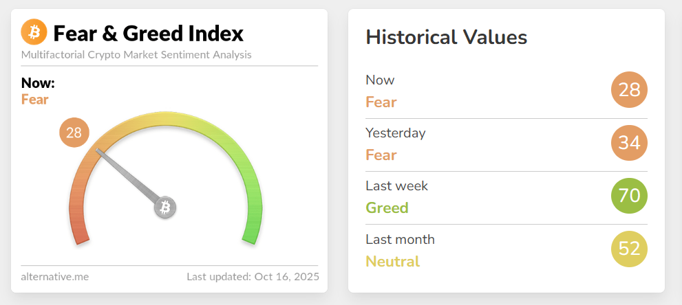 Dựa trên dữ liệu từ Alternative.me, chỉ số “Fear & Greed Index” (Chỉ số Sợ hãi và Tham lam) của thị trường tiền mã hóa ngày 16.10 hiện đang ở mức 28 điểm, tương ứng với vùng “Fear”- sợ hãi. Đây là mức giảm nhẹ so với ngày hôm qua (34 điểm) và đánh dấu sự suy yếu rõ rệt về tâm lý nhà đầu tư so với tuần trước, khi chỉ số còn ở mức 70 điểm (Greed - tham lam).