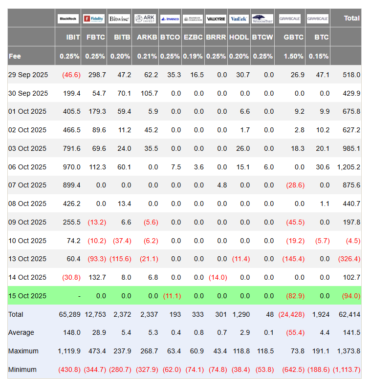 Dựa trên dữ liệu từ các quỹ ETF Bitcoin (chưa tính Blackrock), ngày 15.10 ghi nhận dòng tiền rút ròng trở lại, với tổng trị giá 94 triệu USD, cho thấy tâm lý thận trọng vẫn bao trùm toàn thị trường sau nhịp hồi ngắn vào ngày trước đó.