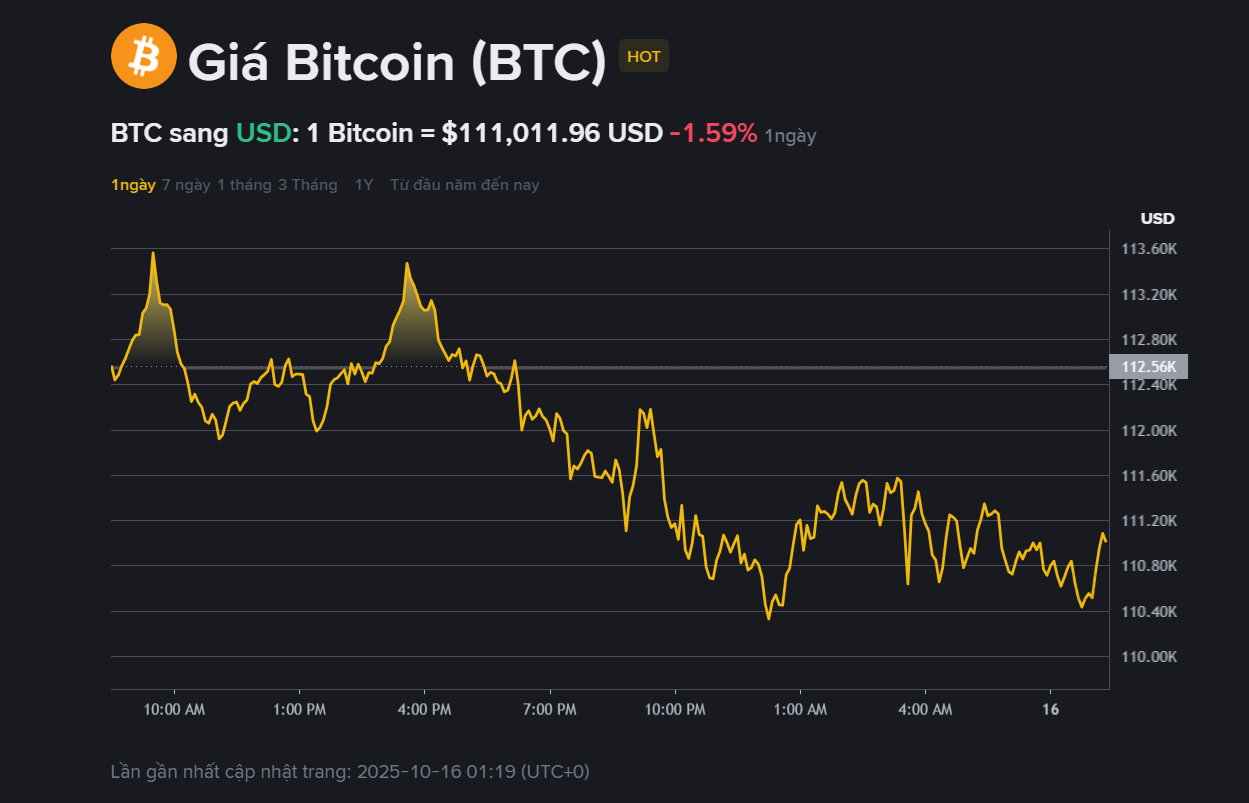 Tính đến sáng 16.10, Bitcoin được giao dịch quanh 111.000 USD, giảm 1,6% trong 24 giờ qua - Ảnh: Binance