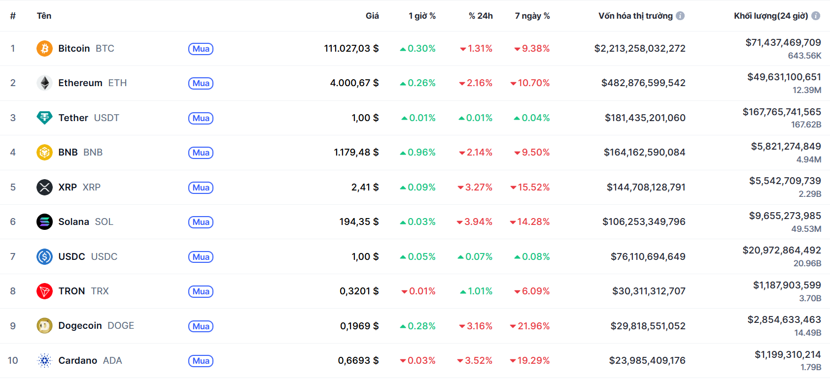 Hầu hết các altcoin (tiền mã hóa ngoài BTC) đều giảm từ 1% đến gần 4%, cho thấy áp lực bán vẫn chiếm ưu thế. Ethereum (ETH), đồng tiền lớn thứ hai thị trường, giảm 2,16%, hiện giao dịch quanh 4.000 USD, dù khối lượng giao dịch đạt gần 49,6 tỉ USD nhưng lực mua vẫn chưa đủ mạnh để đảo chiều xu hướng.