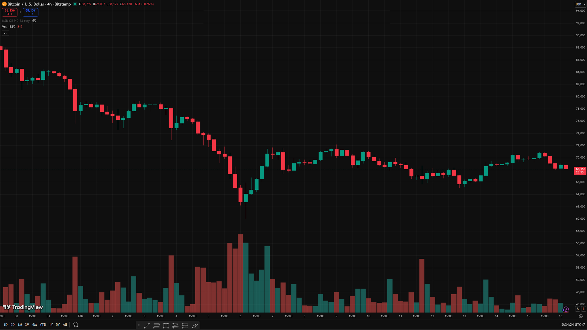 Biểu đồ BTC/USD theo khung 4 giờ tính đến 16.2 - Ảnh: TradingView/Bitstamp