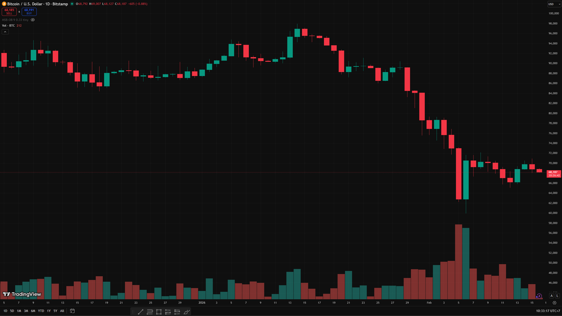 Trên khung ngày (D1), Bitcoin vẫn duy trì xu hướng giảm trung hạn khi cấu trúc đỉnh thấp dần và đáy thấp dần chưa bị phá vỡ. Sau khi không thể chinh phục lại vùng 100.000 USD, giá bắt đầu suy yếu và bước vào nhịp điều chỉnh mạnh. Đầu tháng 2, thị trường chứng kiến cú lao dốc đáng kể, kéo BTC về vùng 60.000 USD với khối lượng tăng đột biến. Điều này phản ánh áp lực bán chiếm ưu thế và hàng loạt ngưỡng hỗ trợ trước đó bị xuyên thủng.