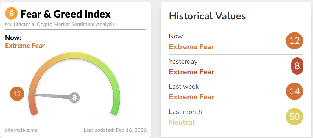 Chỉ số Fear & Greed Index ngày 16.2 ghi nhận mức 12 điểm, tiếp tục duy trì trạng thái Extreme Fear (sợ hãi tột độ). Dù đã nhích lên so với hôm qua (8 điểm), tâm lý chung của thị trường vẫn nghiêng mạnh về sự thận trọng và phòng thủ. Nhà đầu tư vẫn chưa sẵn sàng quay lại với rủi ro cao, đặc biệt trong bối cảnh giá còn biến động khó lường.