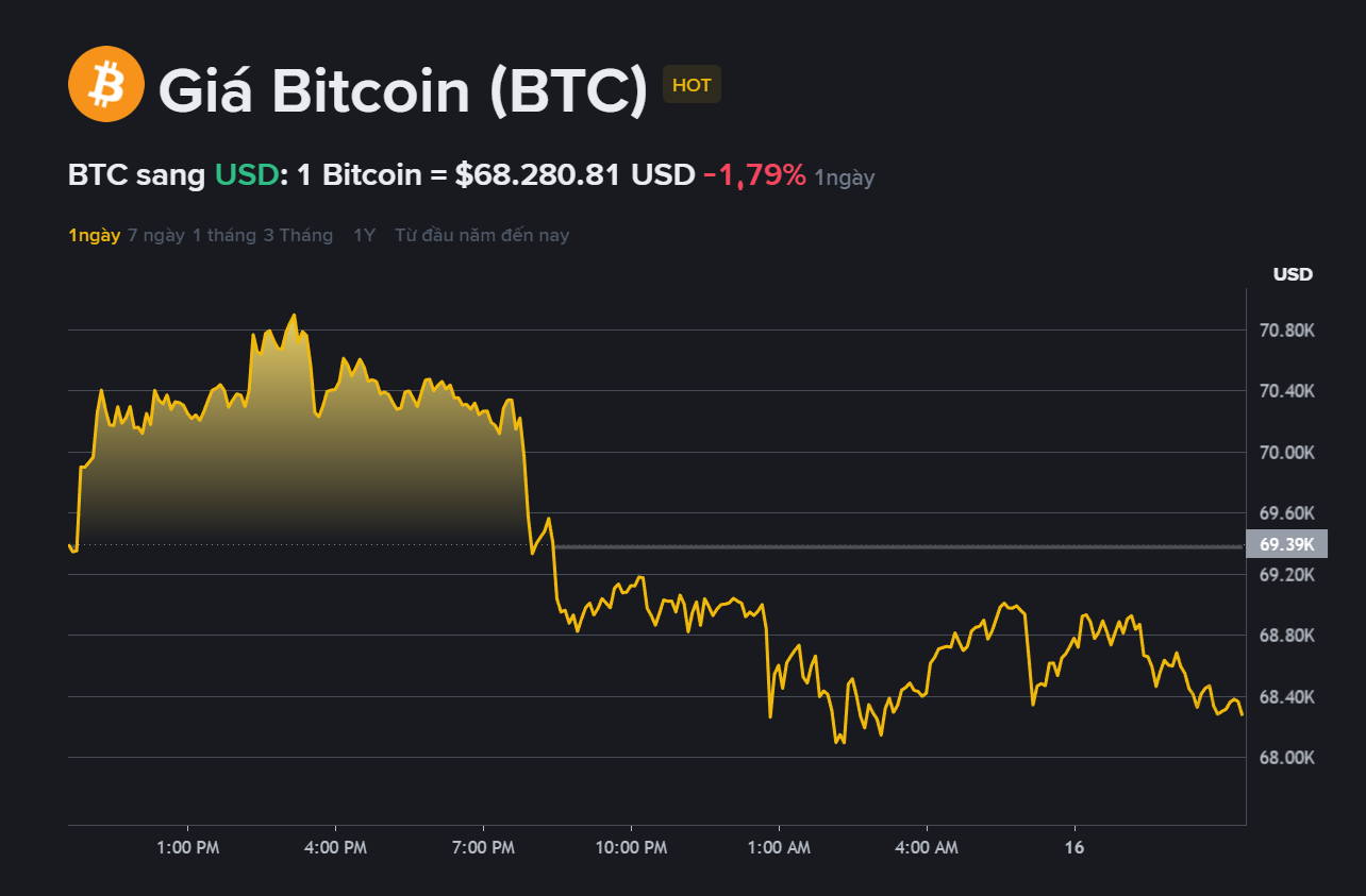 Giá Bitcoin hiện đang giao dịch quanh mức 68.280USD, với vốn hóa thị trường vào khoảng 1.364 tỉ USD và khối lượng giao dịch trong 24 giờ đạt hơn 40 tỉ USD.