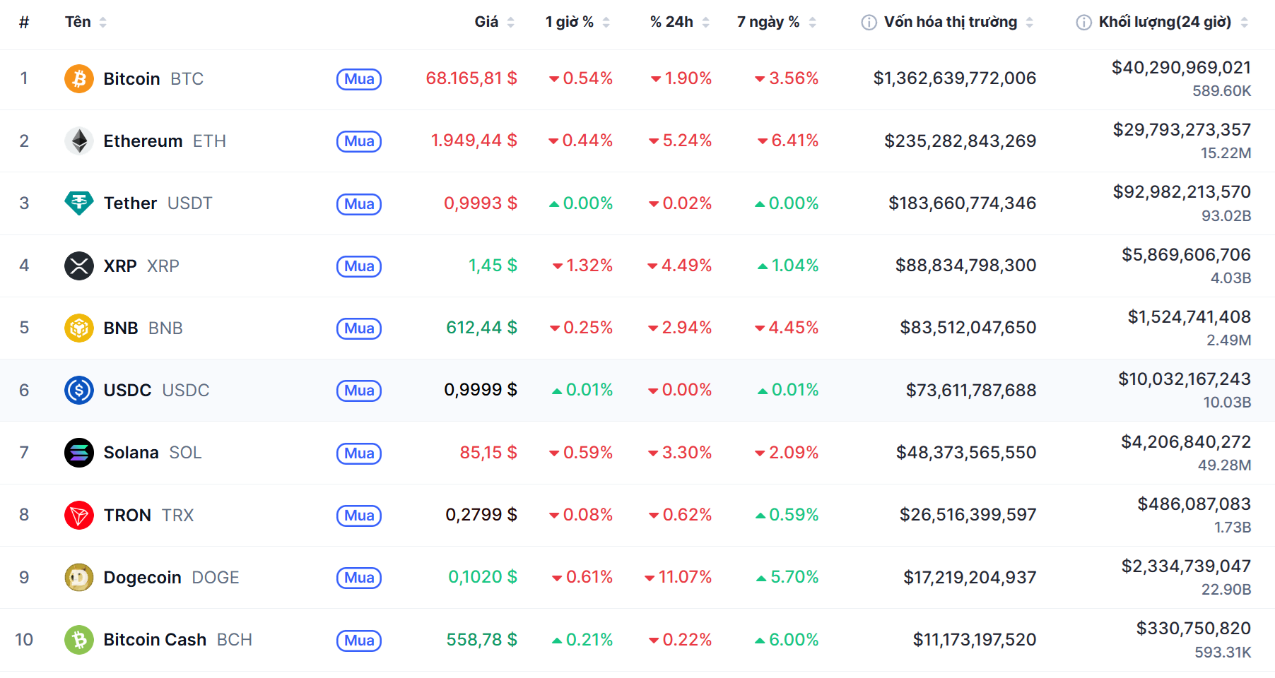 Biến động của Top 10 đồng coin lớn nhất thế giới
