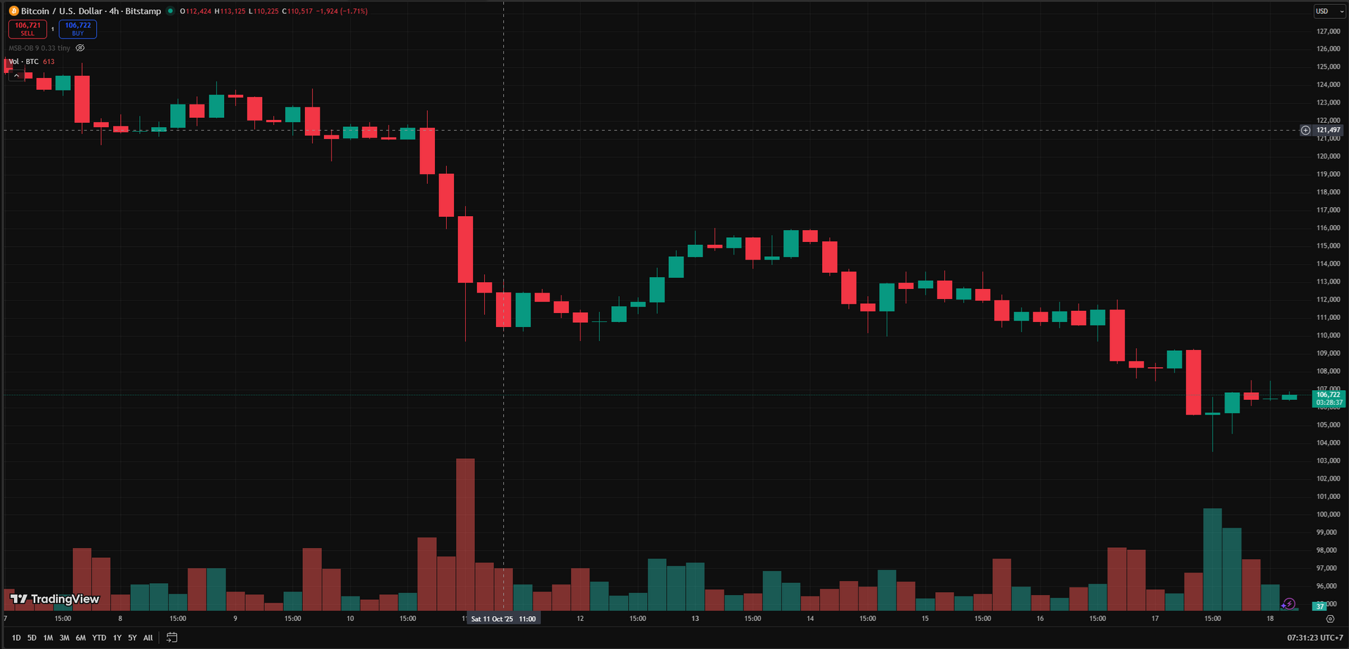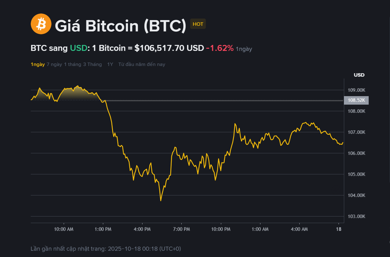 Tính đến sáng 18.10, Bitcoin được giao dịch quanh 106.517 USD, giảm 1,62% trong 24 giờ qua - Ảnh: Binance