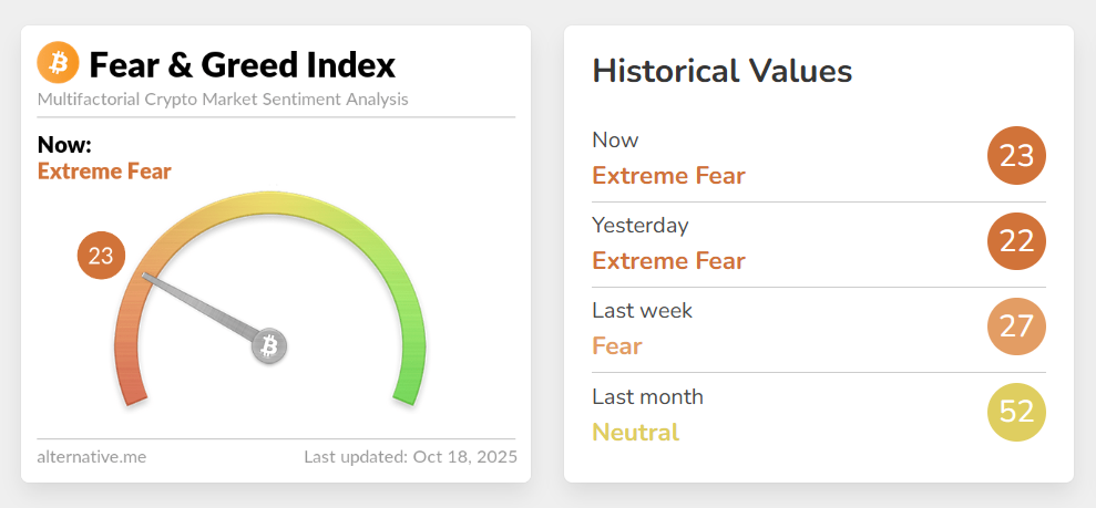 Dựa trên dữ liệu từ Alternative.me, chỉ số “Fear & Greed Index” (Chỉ số Sợ hãi và Tham lam) của thị trường tiền mã hóa ngày 18.10 đạt mức 23 điểm, tương ứng với vùng “cực kỳ sợ hãi”, tương ứng với trạng thái “sợ hãi tột độ” (Extreme Fear).
