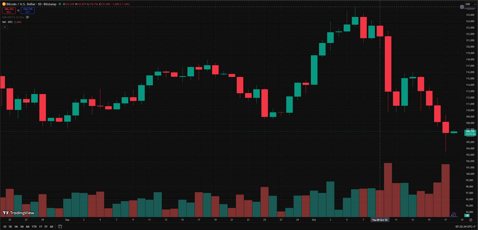 Biểu đồ giá theo ngày của BTC tính đến 18.10 - Ảnh: TradingView/Bitstamp