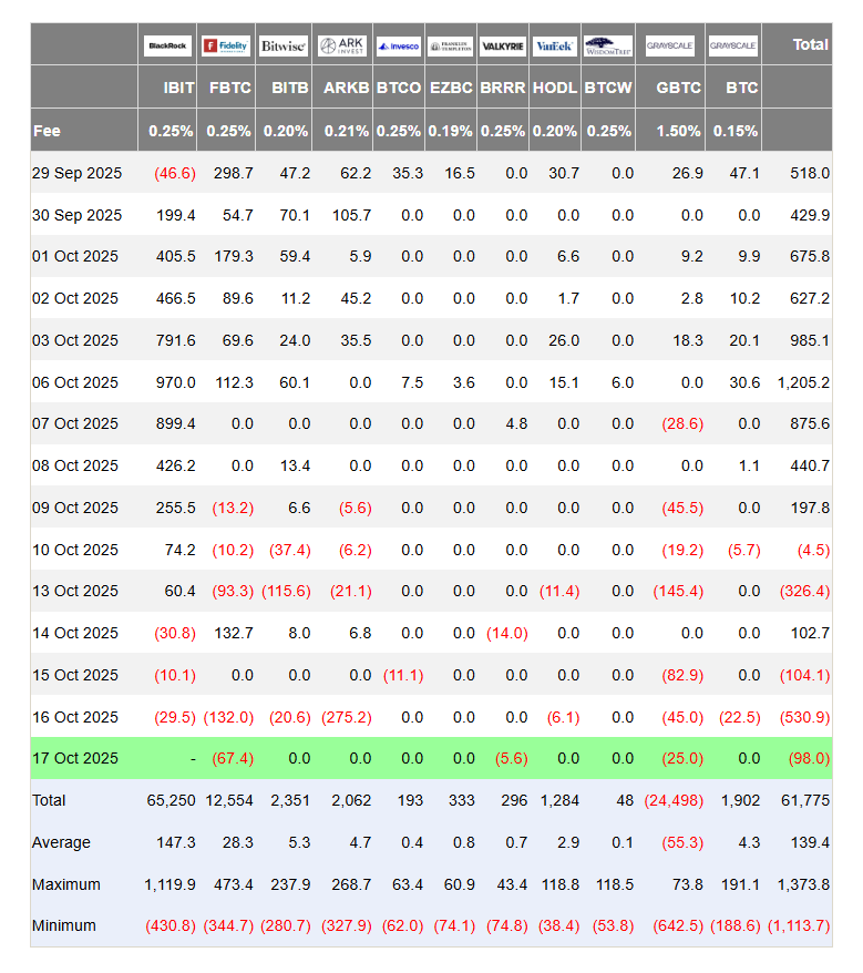 Dòng tiền ETF BTC từ ngày 29.9 đến 17.10 (đơn vị triệu USD) - Ảnh: Farside Investors