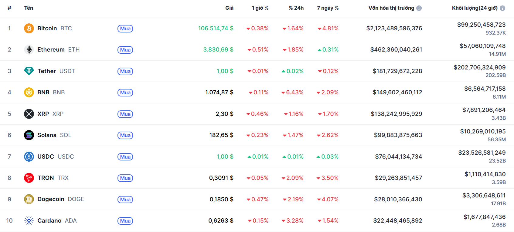 BNB (BNB) là đồng giảm mạnh nhất với mức 6,43%, xuống 1.074,87 USD. Các đồng khác như XRP, Solana (SOL), TRON (TRX), Dogecoin (DOGE) và Cardano (ADA) cũng đồng loạt giảm lần lượt 1,16%, 1,47%, 2,09%, 2,19% và 3,28%.