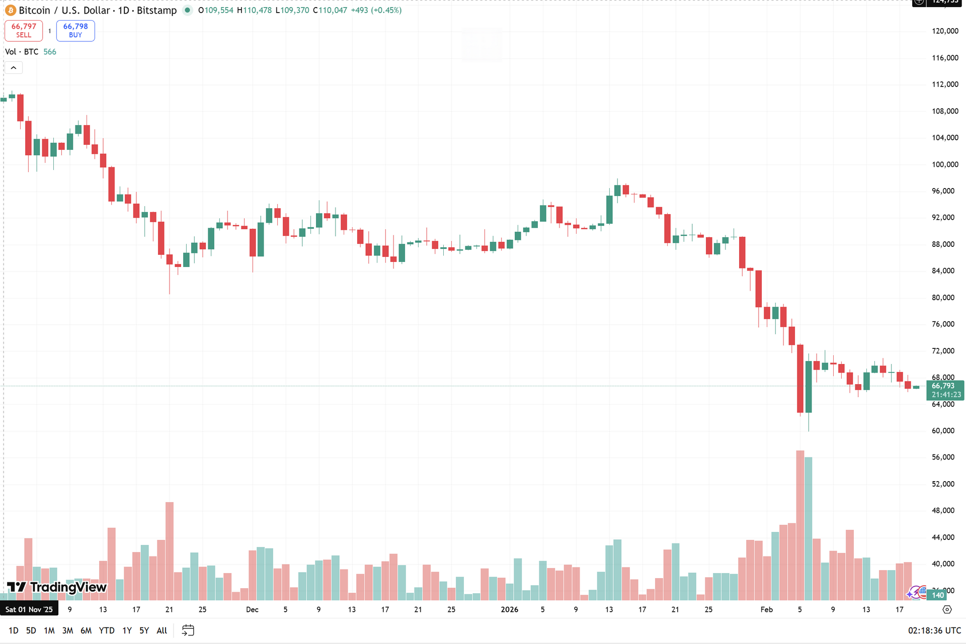 Biểu đồ giá theo ngày của BTC tính đến 19.2 - Ảnh: TradingView/Bitstamp