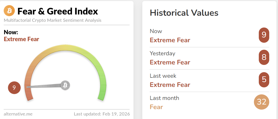Chỉ số Sợ hãi & Tham lam (Fear & Greed Index) của thị trường tiền mã hóa ngày 19.2 ghi nhận mức 9 điểm, tiếp tục nằm trong vùng Extreme Fear (sợ hãi tột độ). Đây là một trong những ngưỡng tâm lý thấp, phản ánh sự bi quan đang bao trùm thị trường tiền mã hóa.