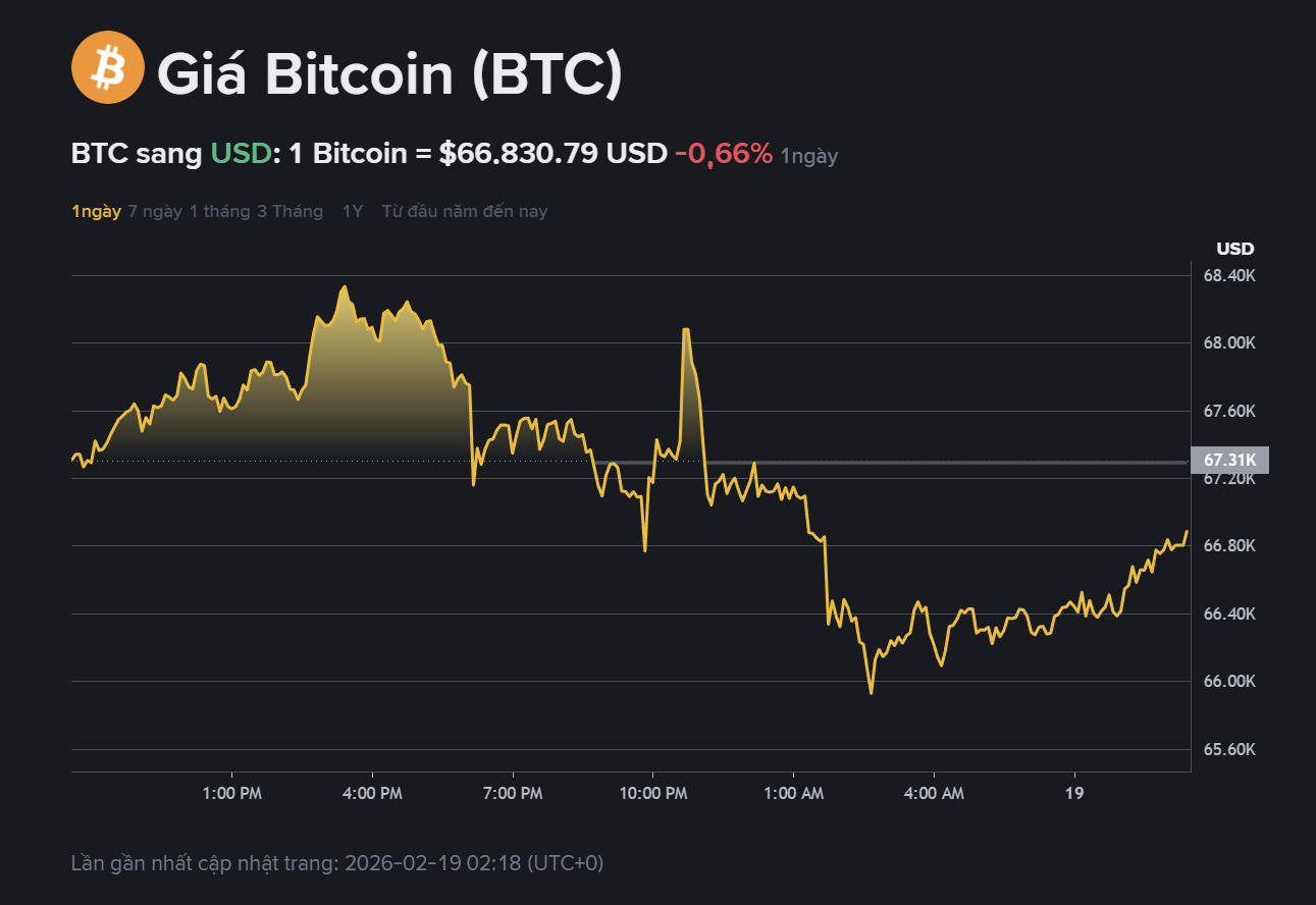 Tính đến sáng 19.2, Bitcoin được giao dịch quanh 66.830 USD, giảm 0,66% trong 24 giờ qua - Ảnh: Binance