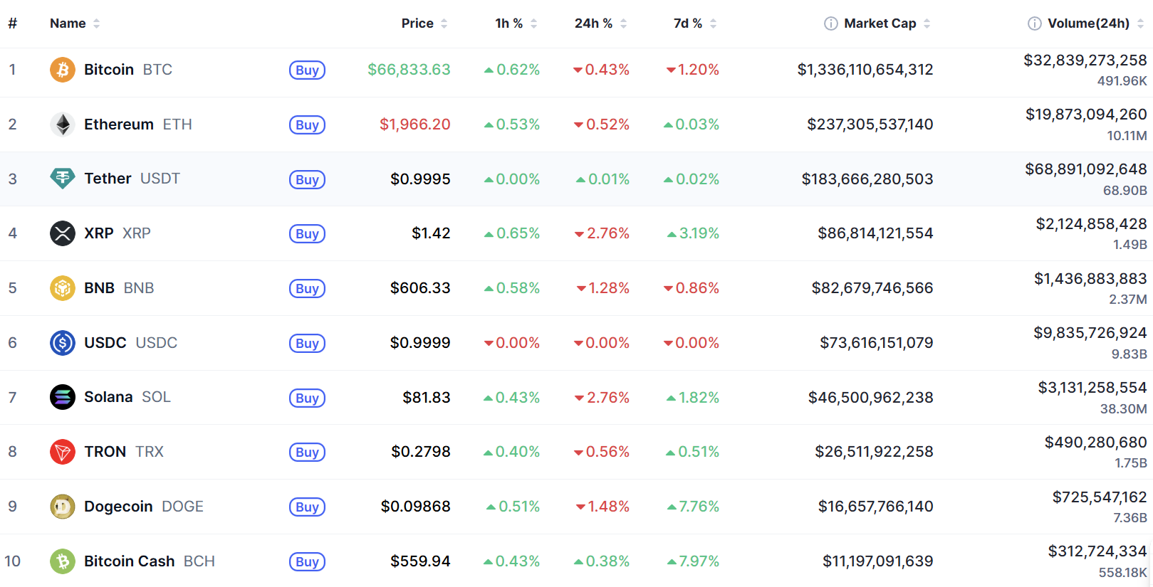 Giá Bitcoin hiện đang giao dịch quanh mức 66.830 USD, với vốn hóa thị trường vào khoảng 1.337 tỉ USD và khối lượng giao dịch trong 24 giờ đạt hơn 30 tỉ USD.