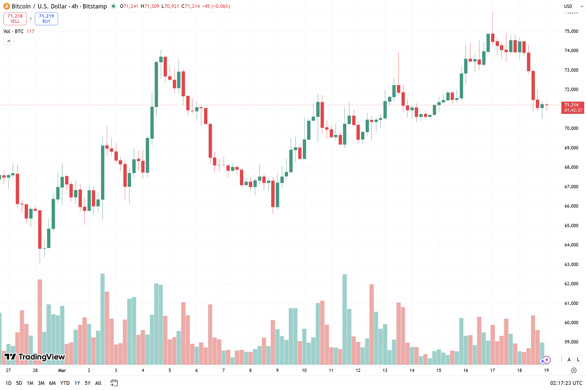 Biểu đồ BTC/USD theo khung 4 giờ tính đến 19.3 - Ảnh: TradingView/Bitstamp